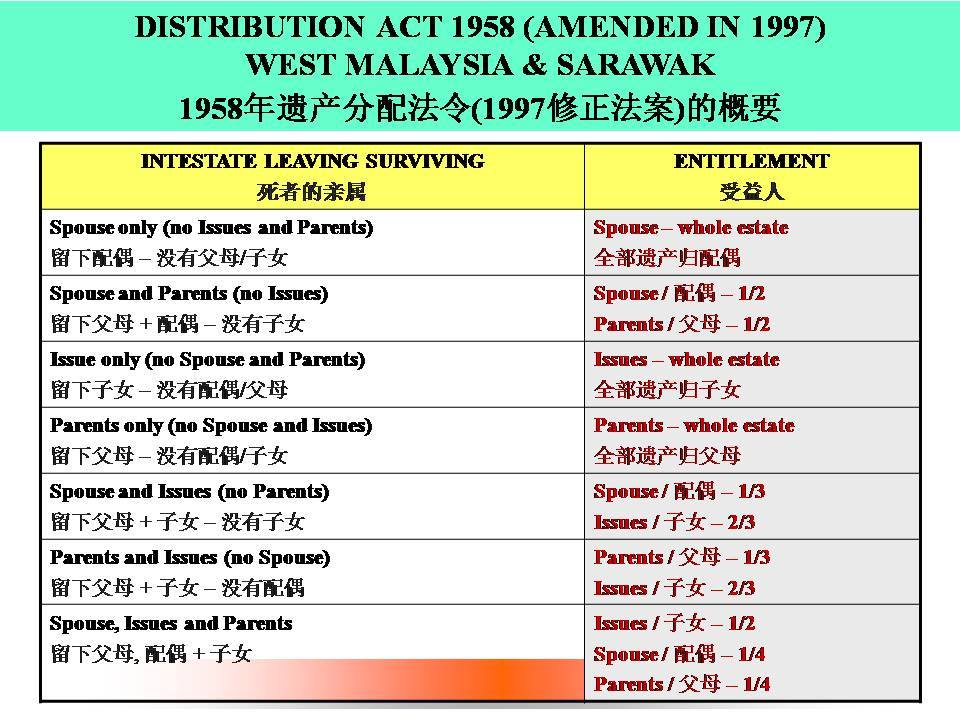 Under the Malaysia Inheritance Law Distribution (Distribution Act 1958 for non-Muslims), your assets are divided mechanically based on who survives you.